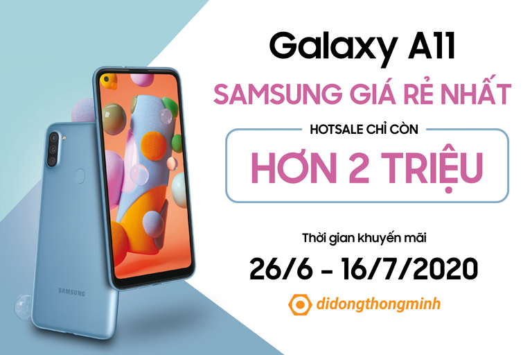 Trong thời gian từ ngày 26/06 – 16/07/2020, Samsung kết hợp cùng Di Động Thông Minh triển khai chương trình khuyến mãi sale sốc dành cho siêu phẩm Galaxy A11. Giá thành sản phẩm giảm sâu, chỉ với 2.790.000 VNĐ là bạn có thể sở hữu ngay chiếc smartphone đầu bảng dòng Galaxy A- series của Samsung nói riêng và trong toàn phân khúc phổ thông nói chung – một mức giá quá hời dành cho các tín đồ công nghệ.