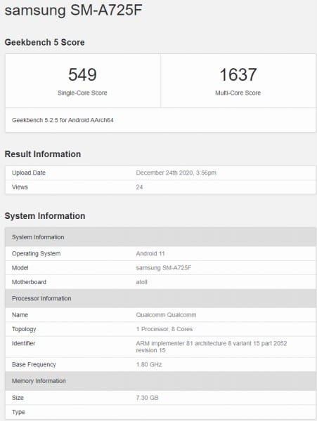Samsung dự kiến sẽ công bố Galaxy A72 4G mới vào quý 1 đầu năm sau. Máy sẽ có các phiên bản 4G và 5G, tương ứng với ký hiệu model SM-A725F và SM-A726B. Ngoài ra, Samsung vẫn chưa tiết lộ bất cứ điều gì về A72, nhưng biến thể 4G của nó đã xuất hiện trên trang đo thông số phần cứng Geekbench với các thông số kỹ thuật chính.