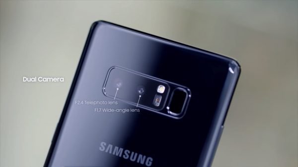 Galaxy Note 8 sở hữu cụm camera kép ở mặt lưng với cùng độ phân giải 12 MP. Trong đó, cảm biến chính có khẩu độ f/1.7, ống kính tele còn lại với khẩu độ f/2.4. Máy ảnh sau của Note 8 có đèn flash LED, hỗ trợ chống rung quang học (OIS), zoom quang học 2x, quay video 4K. Camera selfie 8 MP, khẩu độ f/1.9.