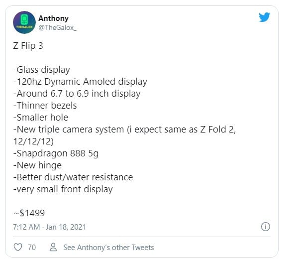 Ngoài ra, anh cũng cho biết một số chi tiết của chiếc điện thoại có thể gập lại sắp tới bao gồm màn hình Dynamic AMOLED 120Hz với viền mỏng hơn. Máy sẽ dùng Snapdragon 888, gợi ý rằng Samsung có thể ra mắt trước nửa cuối năm 2021. Lý do là vì thông thường, Qualcomm cập nhật SoC hàng đầu của mình với dấu ‘+’ vào đầu nửa cuối năm (nghĩa là Snapdragon 888+). Ví dụ, năm ngoái chúng ta đã thấy Z Flip 5G với Snapdragon 865+ mới vào tháng 7 năm 2020.