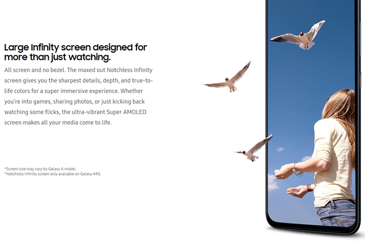 Một quảng cáo trên website của Samsung đã xác nhận điều này. Bạn có thể xem ảnh trên. Hiện tại thì bức ảnh đã bị gỡ xuống nhưng bạn vẫn có thể xem được từ bộ nhớ cache của Google. Phần chú thích đánh dấu sao ở dưới còn ghi rõ màn hình này chỉ có trên Galaxy A90.