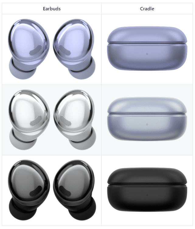 Trang web của Samsung Canada đã lên sản phẩm Galaxy Buds Pro trên trang web của mình, xác nhận tên và số model (SM-R190). Đây là tai nghe không dây nhét tai thế hệ mới nhất của Samsung, nó được trang bị công nghệ chống ồn chủ động mới nhất, sẽ tự động nhận diện người đeo muốn nói chuyện để tắt, bật chống ồn, đồng thời một số tính năng mới. Về giá cả thì vẫn là một ẩn số khi chưa có thông tin tiết lộ, nhưng dự kiến sẽ nằm trên so với Galaxy Buds + và Galaxy Buds Live.