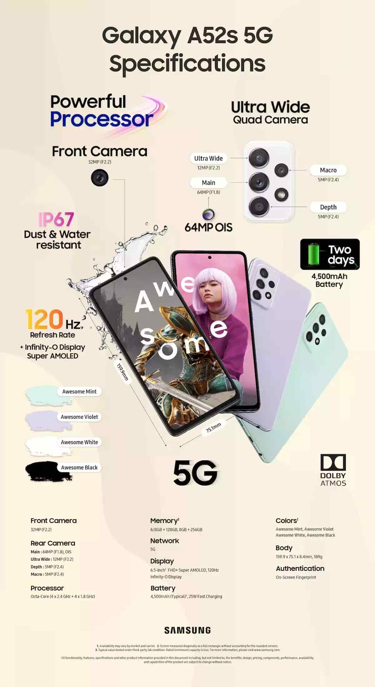 Camera sau với 4 ống kính, camera chính độ phân giải 64 MP có chống rung quang học, camra góc rộng 12 MP, camera marcro 5 MP và Camera hỗ trợ đo chiều sâu 5 MP. Cam selfie hỗ trợ lên đến 32 MP với công nghệ làm đẹp tự động AI. Các thông số khác có lẽ tương tự như Galaxy A52 5G