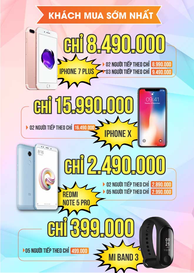 1. Siêu khuyến mãi khách mua sớm nhất – iPhone X q.tế giá 15.990K | iPhone 7 Plus q.tế giá 8.490K | Mi Band 3 giá 399K