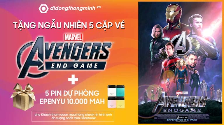 - Tặng ngẫu nhiên 5 cặp vé xem phim bom tấn AVENGERS: ENDGAME + 5 Pin Dự Phòng Epenyu Chính Hãng 10.000 mAh cho Khách tham quan mua hàng checkin hình ảnh ấn tượng nhất trên Facebook.