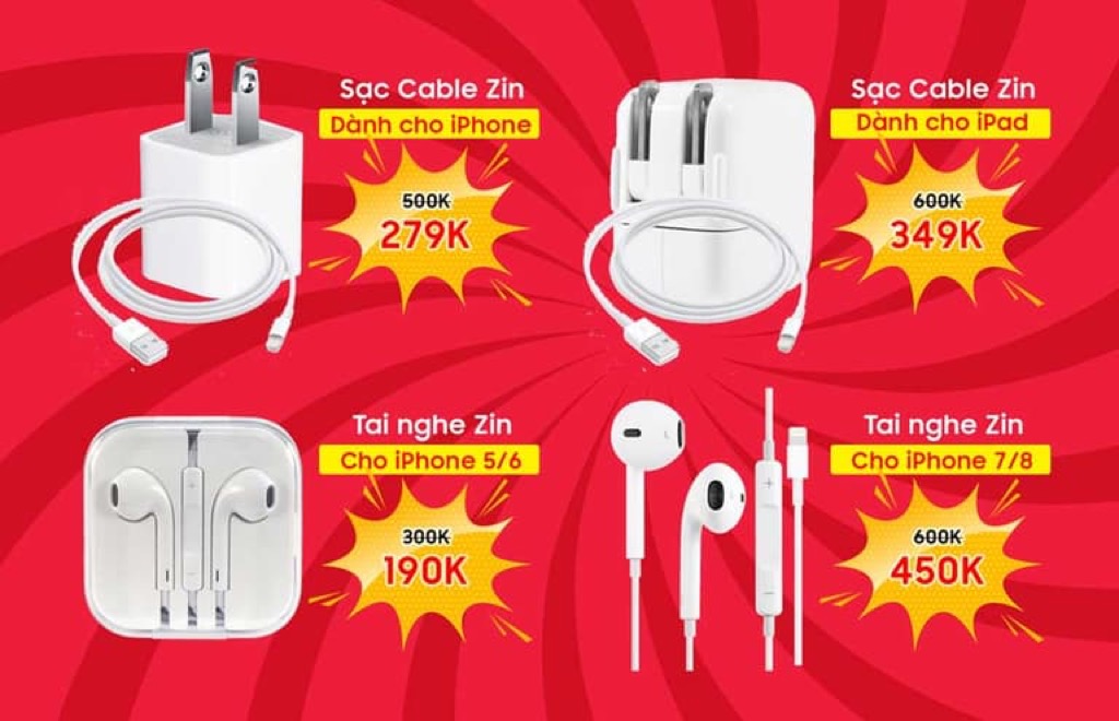 Không chỉ được thu cũ đổi mới sạc, cable tai nghe iPhone, khách hàng tham gia chương trình khuyến mại trong 2 ngày 20/4 và 21/4 còn có cơ hội mua rất nhiều phụ kiện giá sốc ưu đãi cực lớn, chi tiết như sau: