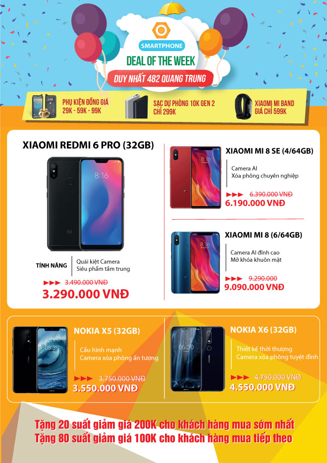 Showroom 482 Quang Trung đã trở thành điểm đến quen thuộc của các bạn yêu công nghệ khu vực quận Gò Vấp, sau các chương trình Ngày Vàng và mừng Sinh Nhật 3 tuổi, cũng như nhiều sự kiện khác rất bạn đã ủng hộ và mua hàng trong thời gian vừa qua. Để tiếp tục tri ân những tình cảm đó Di Động Thông Minh xin gửi tới các bạn chương trình ưu đãi đặc biệt: “Deal Of The Week – Giảm giá tới 200K – Phụ kiện đồng giá chỉ từ 29K” diễn ra duy nhất trong 2 ngày cuối tuần từ 15/09 – 16/09/2018 dành cho Showroom 482 Quang Trung, P10, Q Gò Vấp, tp HCM