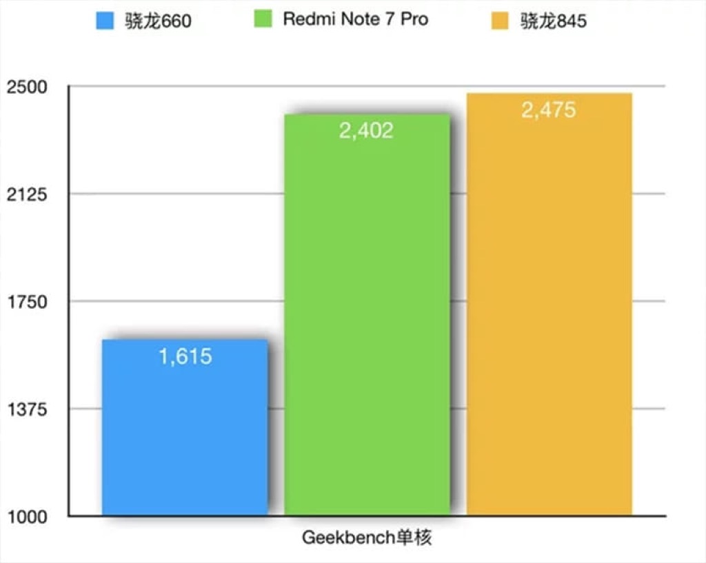 Với chip Snapdragon 675, điểm lõi đơn của Redmi Note 7 Pro trên GeekBench đạt con số 2.402 điểm, chỉ kém 73 điểm so với điểm lõi đơn của Snapdragon 845 và bỏ xa điểm lõi đơn của Snapdragon 660.