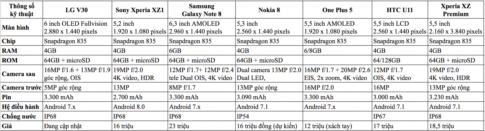 So sánh cấu hình LG V30, Xperia XZ1, Galaxy Note 8 và các flagship hiện nay - Di Động Thông Minh