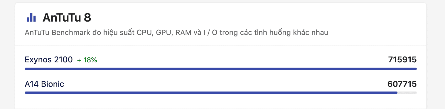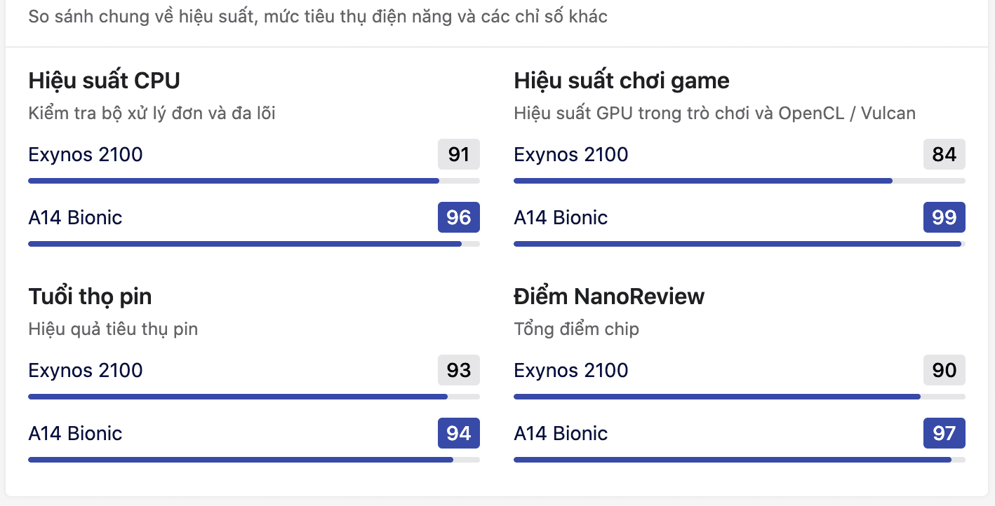 Nhìn vào bảng so sánh có thể thấy, Exynos 2100 mang lại hiệu năng khá ấn tượng với điểm antutu 715915, nhiều hơn Apple A14 chỉ hơn 607715 điểm. Tuy nhiên xét về khía cạnh hiệu suất chơi game, hiệu suất CPU, và khả năng tiết kiệm pin thì Apple A14 lại nhỉnh hơn Exynos 2100 một chút. Tóm lại mặc dù Exynos 2100 đem lại hiệu năng kém Apple A14 thế nhưng xét về thực tế trải nghiệm, con chip này vẫn đáp ứng mọi nhu cầu tác vụ nặng nhất hiện nay mà người dùng cần.
