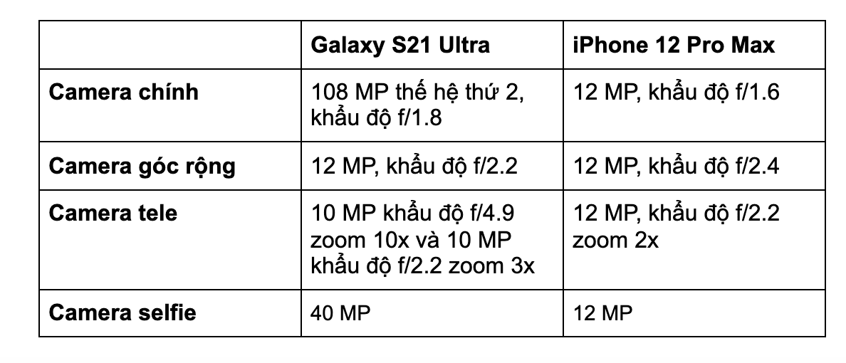 Cuối cùng, không thể bỏ lỡ khía cạnh camera khi so sánh Galaxy S21 ultra và iPhone 12 Pro Max. Trước tiên mình sẽ so sánh về thông số của 2 máy để các bạn tham khảo nhé.