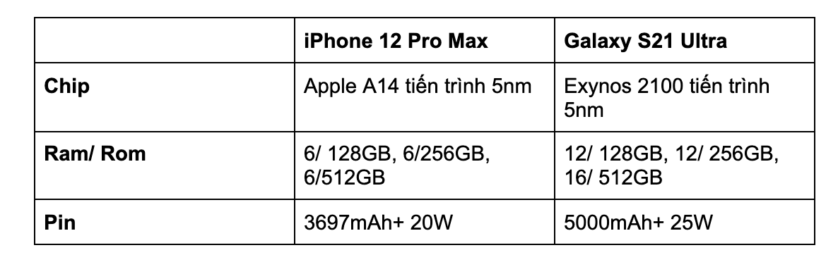 Trước hết về giá bán, iPhone 12 Pro Max chính hãng 128GB chỉ từ 31 triệu. Trong khi Galaxy 21 Ultra ra mắt với giá 1199 USD và được bán chính hãng tại Việt Nam với giá 30.990.000đ.