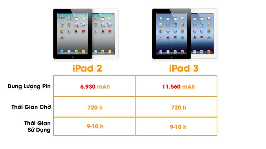 ipad 3 này mặc dù pin cao hơn khá nhiều so với ipad 2, nhưng vì độ phân giải màn hình cùng nâng cấp cấu hình tiêu tốn nhiều năng lượng hơn trong quá trình sử dụng, nên thời lượng sử dụng Pin của 2 chiếc ipad cũng không chênh lệch quá nhiêu đâu các bạn ạ.