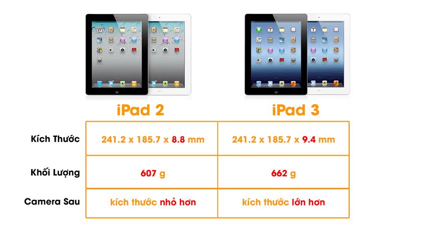 Chính vì thế mặc dù đã ra mắt khá lâu và thua kém khá nhiều so với các dòng ipad mới, nhưng cả 2 chiếc ipad này vẫn mang vẻ ngoài sang trọng hơn so với những chiếc máy tính bảng vỏ nhựa của đa số các đối thủ trên thị trường. Và nếu như cầm cùng lúc hai chiếc ipad này, bạn sẽ có thể nhận ra ipad 2 cũ xách tay nhẹ hơn ipad 3 cũ vì máy rất mỏng, thậm chỉ mỏng hơn cả iphone 4 với độ dày chỉ 8,8mm, trong khi ipad 3 là 9.4mm. Ngoài ra,chiếc camera mặt sau của ipad 2 trông cũng nhỏ hơn so với ipad 3.