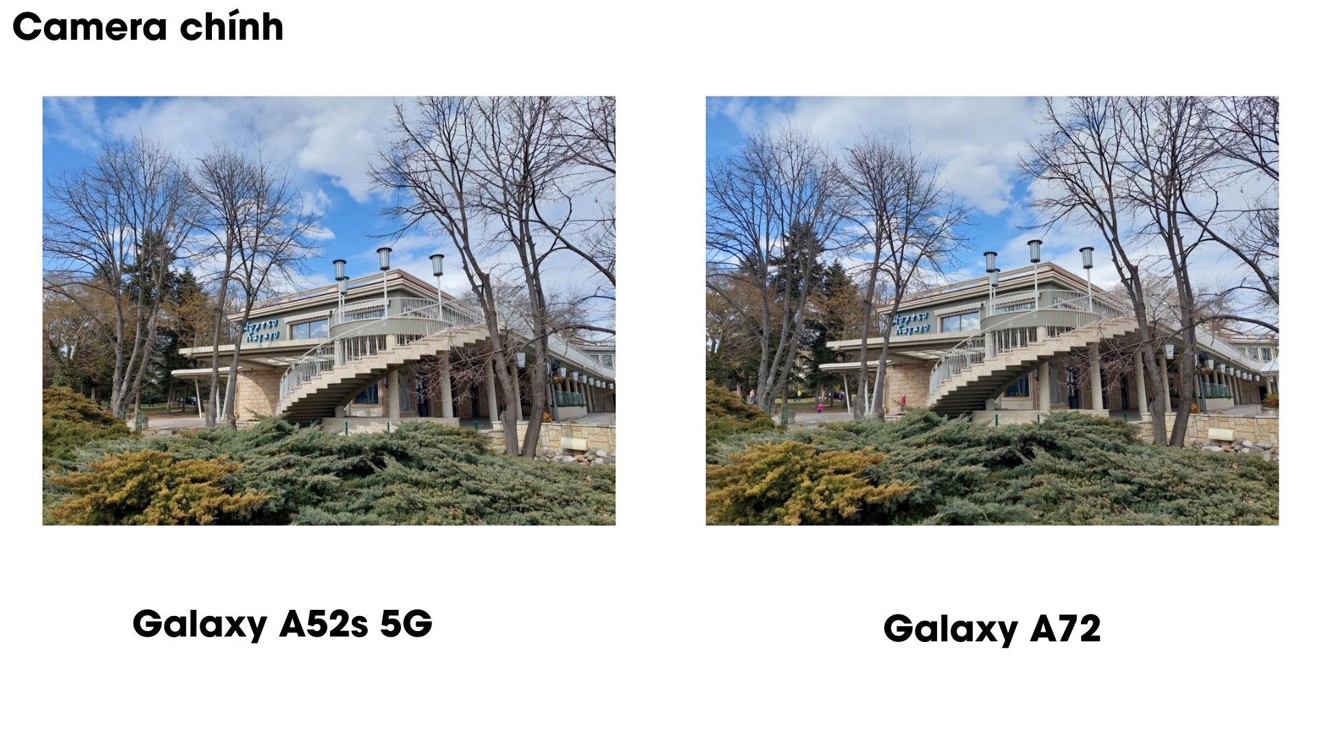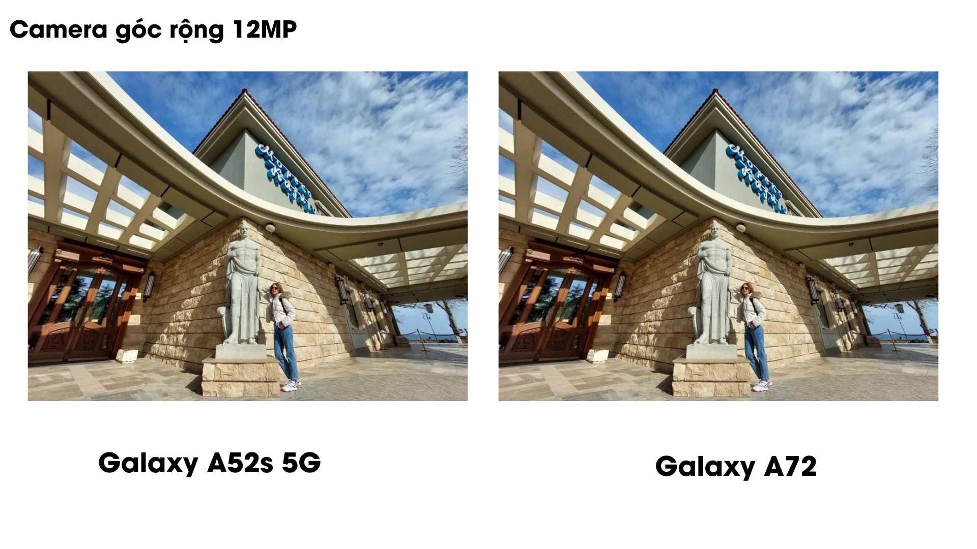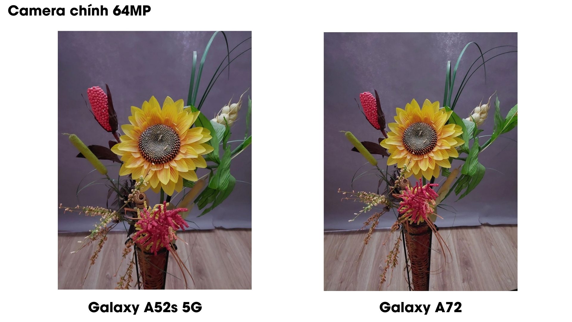 Hai chiếc điện thoại Galaxy A52s 5G và Galaxy A72 đều có camera chính 64MP, camera góc siêu rộng 12MP và camera macro 5MP. Tuy nhiên, A72 đã thay đổi cảm biến độ sâu thành một ống kính tele 8MP, cung cấp zoom quang 3x, OIS và khẩu độ f/2.4. Cả 2 máy đều có camera trước 32MP với khẩu độ f/2.2.