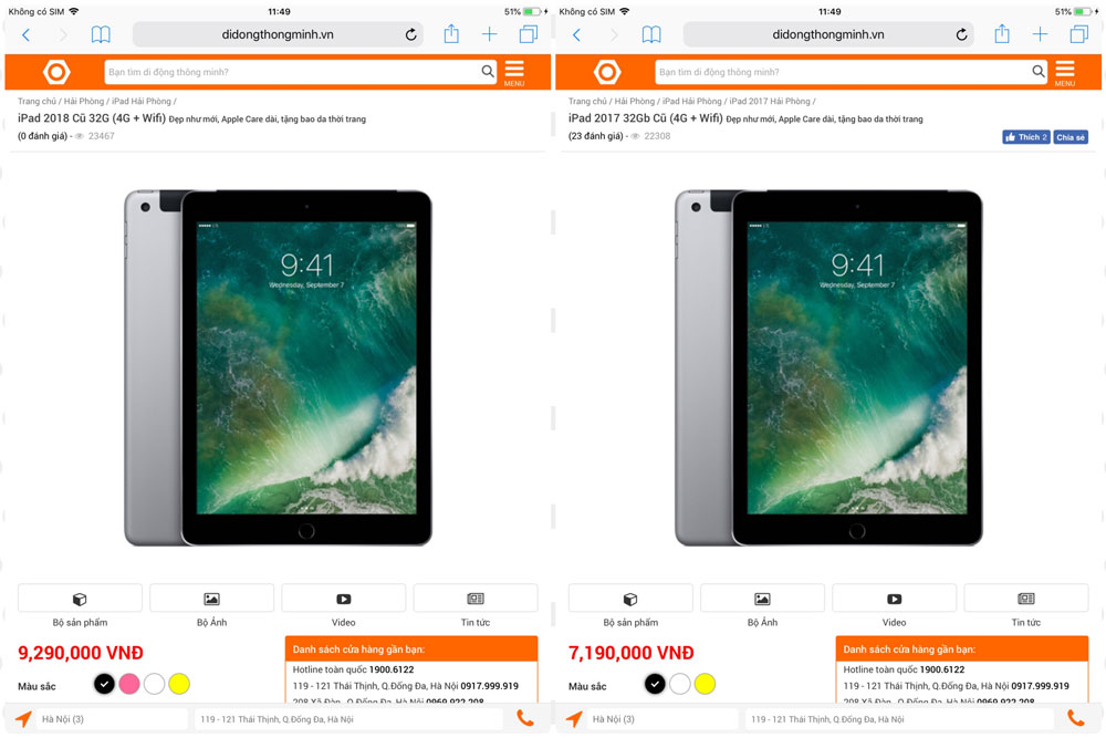 iPad 2017 và iPad 2018 cũ hiện đang có mức giá cực kì tốt. Cụ thể, tại Di Động Thông Minh, iPad 2017 cũ có giá chỉ từ 7.19 triệu đồng. iPad 2018 cũ cao hơn chỉ khoảng 2 triệu đồng là 9.29 triệu đồng.