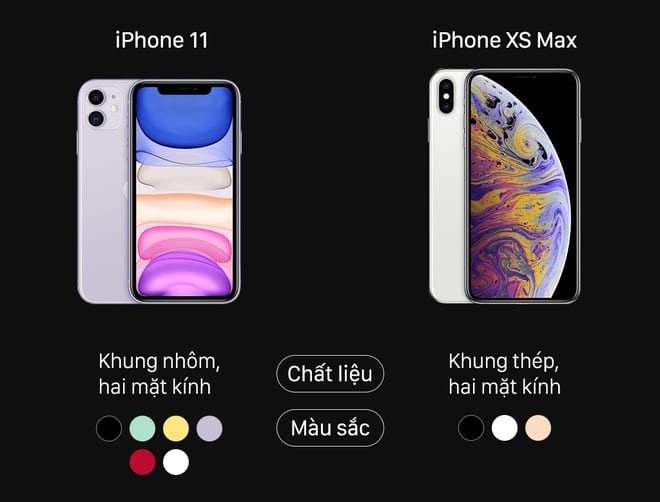 Thiết kế tuỳ vào sở thích mỗi người thế nhưng iPhone Xs Max được gia công bằng kính sang trọng, viền thép không gỉ trong khi iPhone 11 vẫn chỉ thiết kế bằng vỏ nhôm các bạn chỉ cần va đập nhẹ là có thể bị móp máy. Vậy nên về phần thiết kế cá nhân mình lại thiên về Xs Max hơn, nhìn có vẻ như sang trọng hơn so với iPhone 11. Nhưng nếu lựa chọn iPhone 11 bạn sẽ có màu sưu tập phong phú đa dạng và trẻ trung màu Vàng, Xanh, Đỏ, Tím..