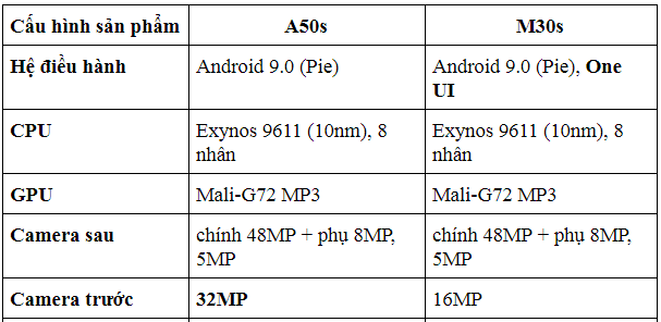 Bảng thống kê chi tiết cấu hình A50s và M30s