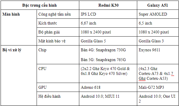 2. So sánh thông số kỹ thuật Galaxy A51 và Redmi K30