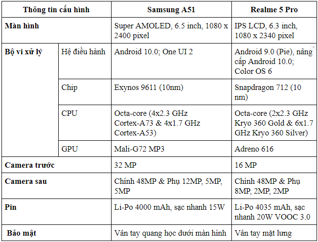 1. Tổng hợp thông tin cấu hình Galaxy A51 và Realme 5 Pro