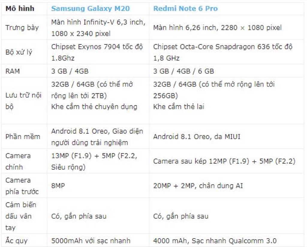 Thông số kĩ thuật của Samsung Galaxy M20 chính hãng và Xiaomi Redmi note 6 Pro