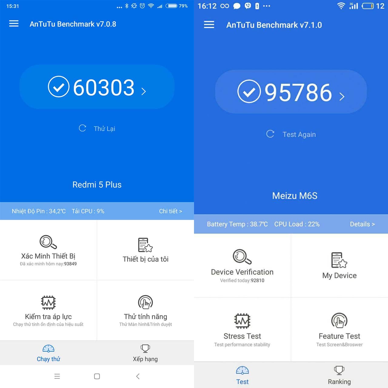 Antutu trên 2 sản phẩm Meizu S và Redmi 5 plus