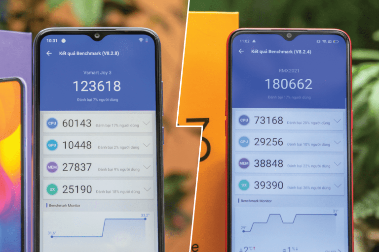 Kiểm tra trên Antutu Realme C3 có điểm CPU và GPU lần lượt đạt khoảng 73.000, 30.000 còn Vsmart Joy 3 điểm CPU và GPU lần lượt chỉ khoảng 60.000, 10.000.