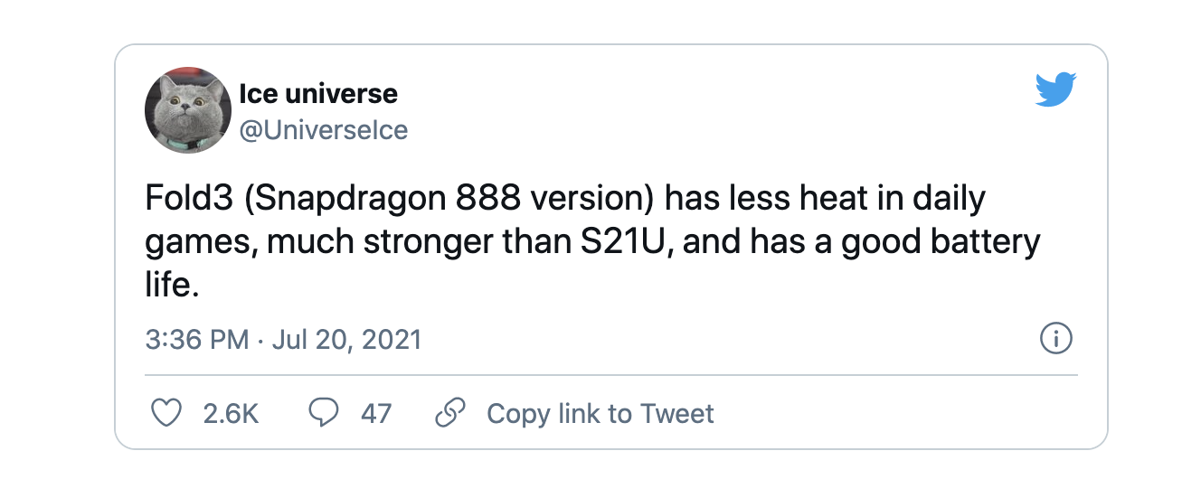 Theo 1 tweeter có tên @IceUniverse Z Fold 3 năm nay sẽ có hai phiên bản dùng chip Snapdragon 888 và con chip Exynos tùy thị trường thay vì chỉ mỗi con chip Snapdragon như Galaxy Z Fold2 5G đã ra mắt trước đó. Có 1 vài tin đồn cho rằng máy sẽ có viên pin 4400mah kèm sạc nhanh 25W. Galaxy Z Fold 3 sẽ được cải thiện khả năng tản nhiệt khi chơi game, thậm chí mát hơn cả Galaxy S21 Ultra 5G.