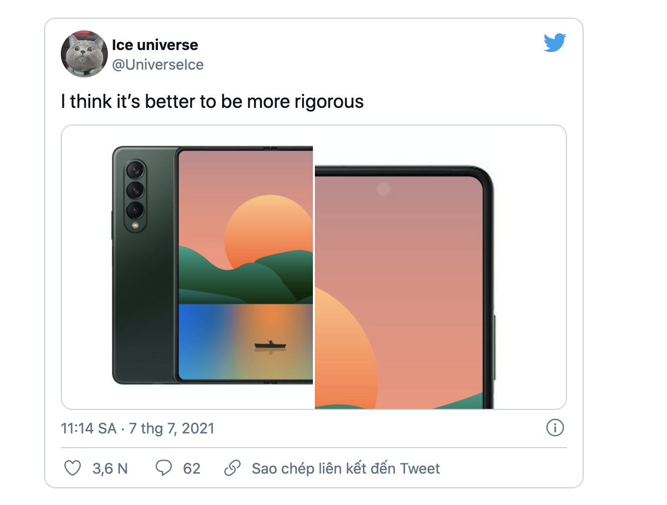 Về camera, Galaxy Z Fold 3 sẽ sở hữu tổng cộng 5 cảm biến bao gồm cảm biến chính, ống kính góc siêu rộng và camera tele), một camera selfie dưới màn hình và camera ảnh selfie nằm trong phần lỗ đục của màn hình phụ. Thông số chính xác có lẽ chúng ta phải đợi ngày Samsung công bố chính thức.