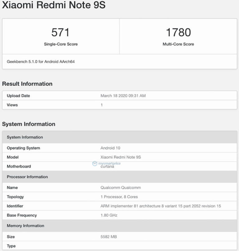 Có thể thấy, Xiaomi Redmi Note 9S trên Geekbench tiết lộ thiết bị này có bộ xử lý Qualcomm tám lõi, đi kèm dung lượng RAM 6GB và chạy trên hệ điều hành Android 10. Với cấu hình trên, điện thoại này ghi được điểm số trên phần mềm Geekbench 5.1 là 571 điểm đơn nhân và 1,780 điểm đa nhân, một kết quả khá tốt trong bảng xếp hạng CPU. Tuy nhiên, cần lưu ý rằng kết quả Geekbench cũng có thể là không hoàn toàn chính xác cho đến khi có thông tin chính thức.