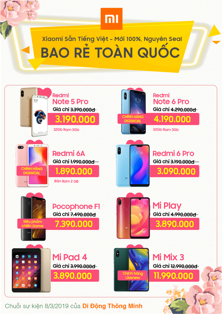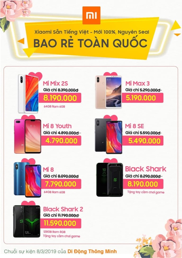 Song song với sự kiện mừng ngày Quốc tế phụ nữ 8/3, Di Động Thông Minh còn triển khai chương trình tặng điện thoại Xiaomi miễn phí vô cùng hấp dẫn. Cụ thể, khách hàng mua điện thoại Xiaomi tại Di Động Thông Minh sẽ có cơ hội nhận được những phần qua như sau: