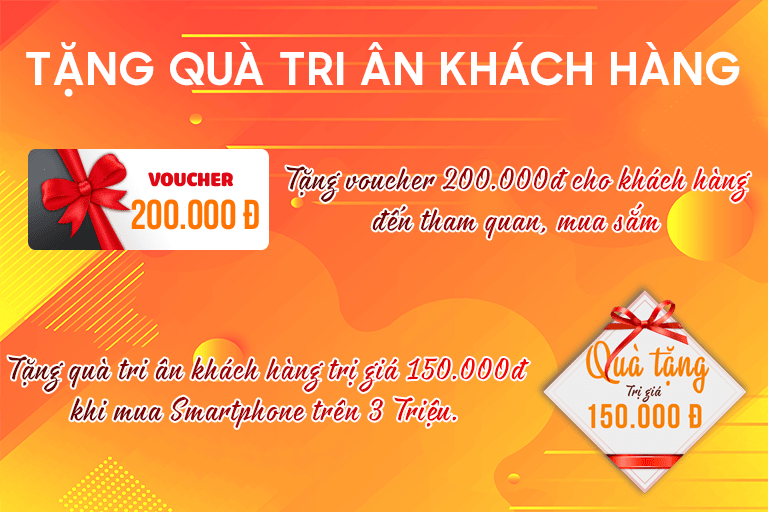 - Khách tham quan, mua sắm: tặng Voucher 200.00đ khi mua điện thoại (Trong đó, 1 voucher 100K trừ thẳng vào giá website, 1 voucher 100K mua hàng vào lần sau)
