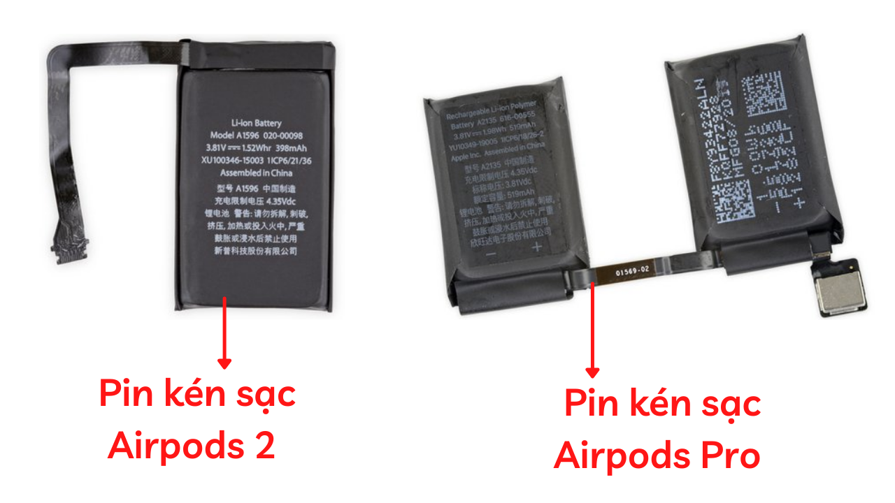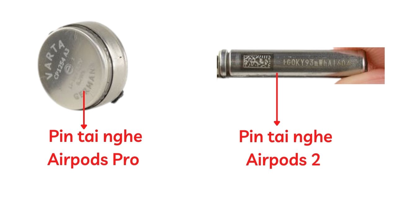 Pin trên Tai nghe là dạng pin hình trụ dài như trên tai nghe AirPods 1/ 2 hoặc là dạng pin cúc áo sạc lại được như trên AirPods Pro, Galaxy Buds Live, Buds Pro, Buds Plus.