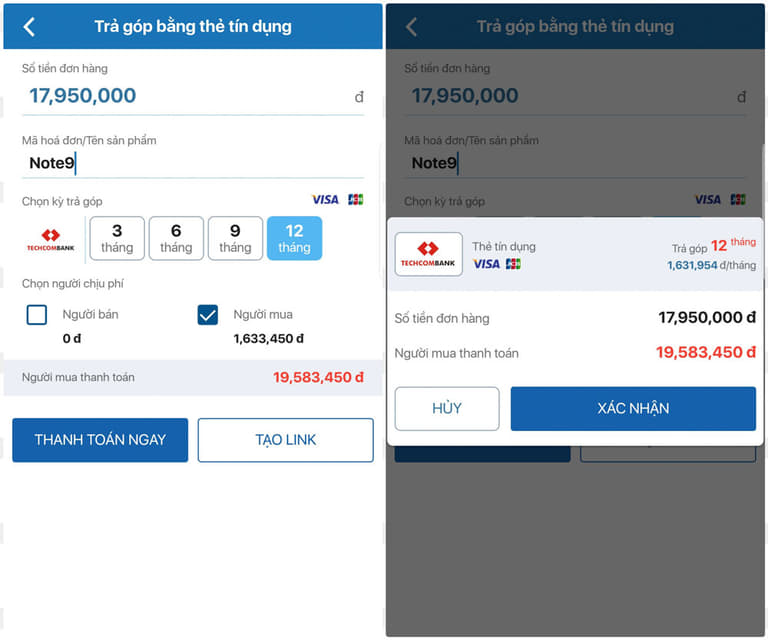 Ví dụ: Khách hàng mua Galaxy Note 9 128GB chính hãng tại Di Động Thông Minh đang có giá 17.950.000đ. Nếu tiến hành thanh toán trả góp 12 tháng tại ngân hàng Techcombank, khách hàng sẽ chỉ phải trả thêm khoản phí thanh toán trả góp với ngân hàng là 1.633.450đ (DDTM không thu bất cứ chi phí nào). Như vậy, tính trong vòng 12 tháng, mỗi tháng chúng ta chỉ mất thêm hơn 100.000đ.