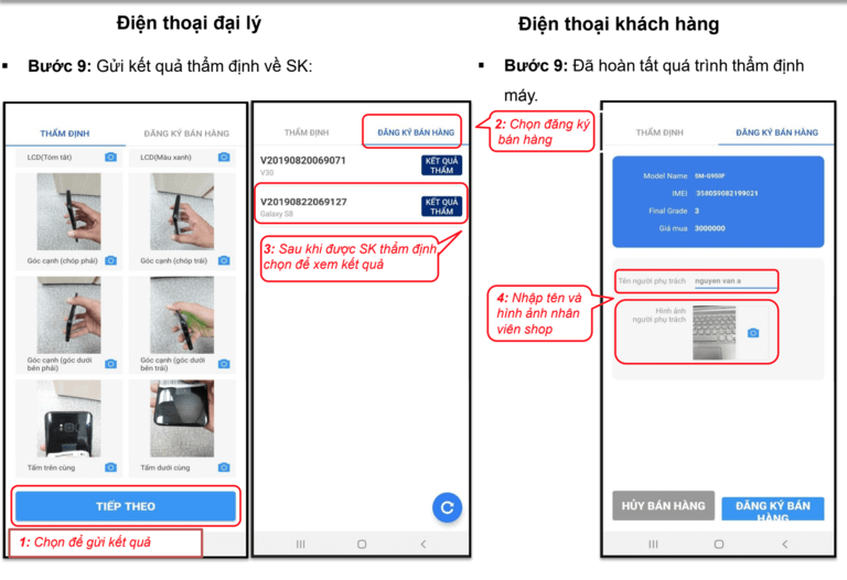 - Bước 3: Sau quá trình thẩm định, kết quả giá thu mua lại điện thoại của quý khách sẽ hiển thị ở màn hình phần mềm Q-Check trên điện thoại của quý khách. Chuyên viên dịch vụ của DĐTM sẽ làm phiếu “lên đời siêu phẩm” Galaxy Note 10, Note 10+ để quý khách nhận máy.