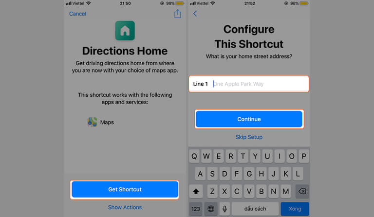 Bước 2: Bảng thông báo cài đặt phím tắt hiện ra, hãy chọn Get Shortcut > Tiếp theo hãy thiết lập địa chỉ nhà bạn ở mục Line 1 và chọn Continue.