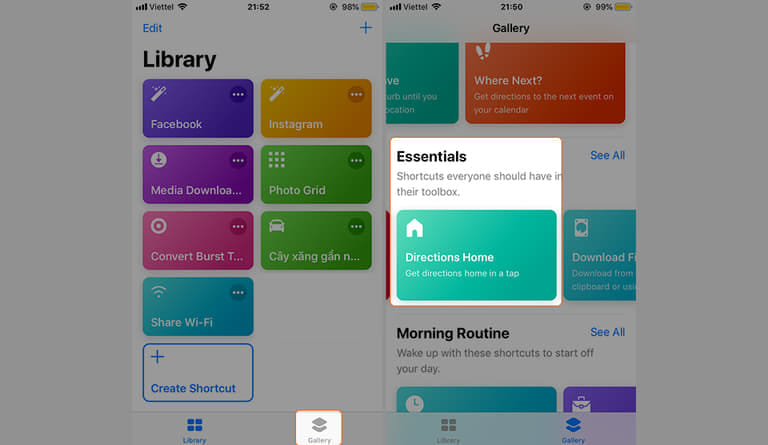 Bước 1: Mở ứng dụng Siri Shortcuts trên iPhone của bạn lên, sau đó chuyển sang mục Gallery > Kéo xuống tìm mục Essentials và tìm phím tắt “Directions Home”.