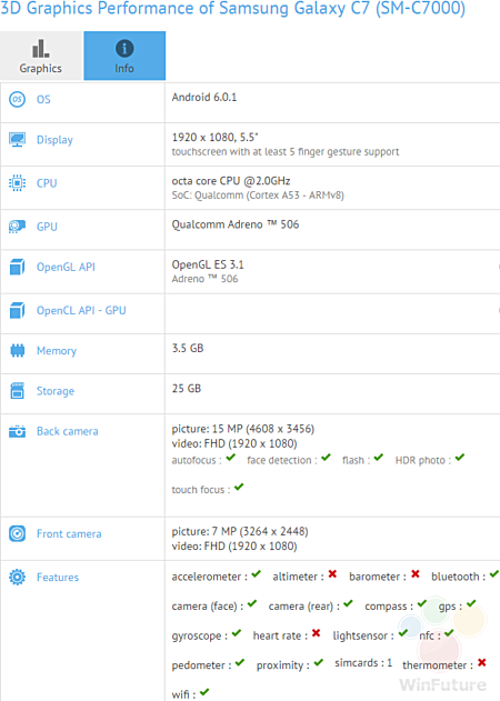Theo đó, Galaxy C7 với mã hiệu SM- C7000 sẽ sở hữu một màn hình 5.5 inch độ phân giải fullHD. Máy sẽ được trang bị con chip Snapdragon 625 64 bit, 4 GB RAM và bộ nhớ trong 32 GB. Camera chính của Galaxy C7 có độ phân giải 16 MP và camera phụ lên đến 8 MP cao hơn cả siêu phẩm Galaxy S7 chỉ có 5 MP. Máy sẽ chạy trên hệ điều hành Android M 6.0.1 mới nhất ngay khi xuất xưởng.