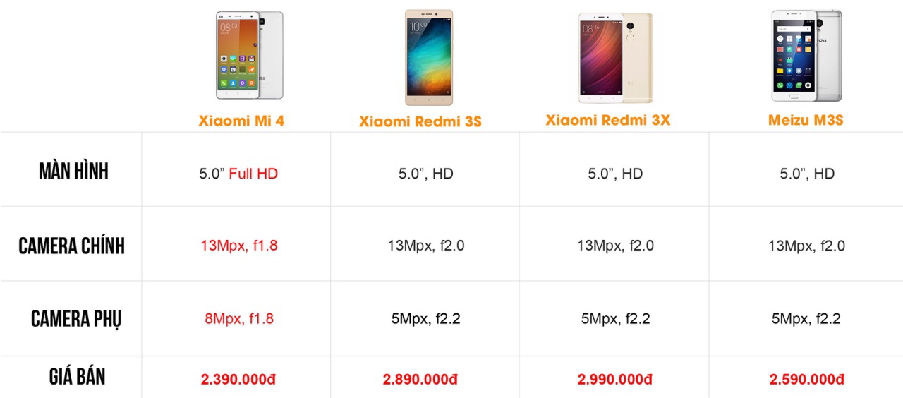Tuy đã ra mắt cộng đồng công nghệ được 3 năm rồi, nhưng Mi 4 vẫn thu hút rất nhiều người yêu công nghệ với mức giá hiện nay chỉ còn 2tr390 tại DDTM. So với các smartphone cùng tầm giá như Redmi 3X, Redmi 3S hay Meizu M3S thì chúng ta cũng ko lấy gì làm lạ khi Mi 4 sở hữu sức hút lớn như vậy, các bạn có thể thấy rõ qua bảng so sánh về màn hình và camera, khi Mi 4 đã có màn FullHD sắc nét hơn nhiều so với 3 sản phẩm còn lại đi kèm thông số camera ấn tượng hơn mà mức giá lại rẻ hơn từ 200-500k. Hiện Xiaomi Mi 4 là 1 trong 3 smartphone đáng mua nhất tại DDTM nói riêng và trong mọi thời đại nói chung.