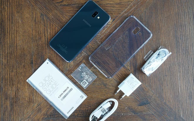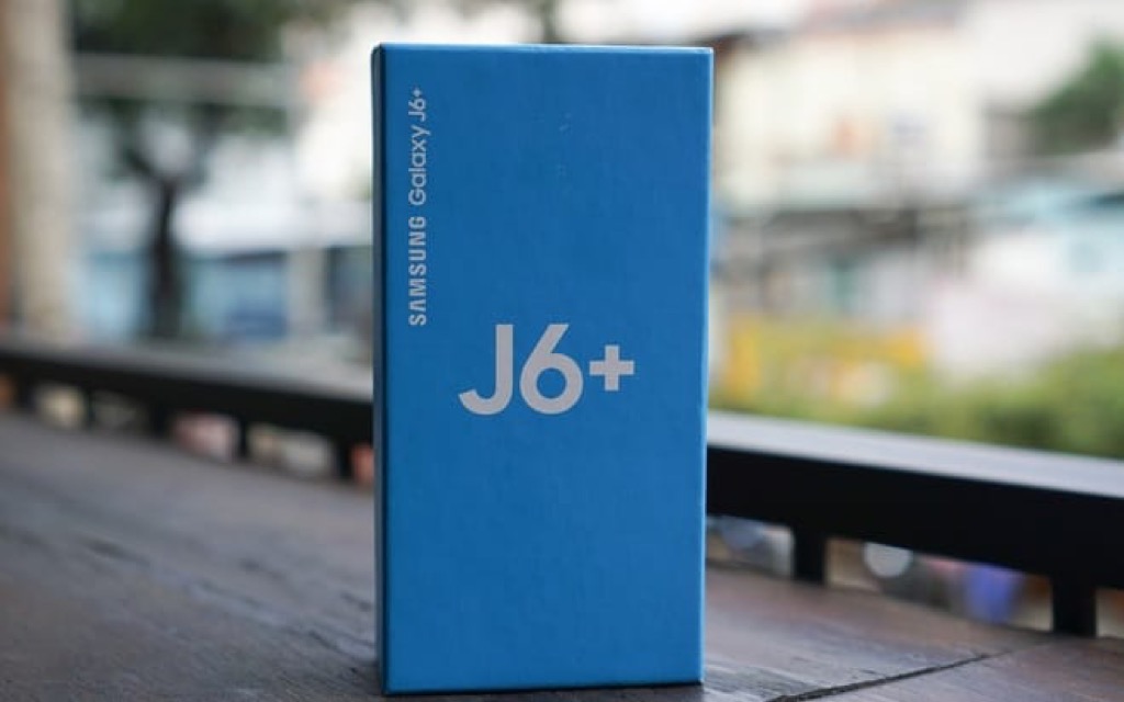 Hộp đựng Galaxy J6+ vẫn giữ tông màu chủ đạo xanh dương cùng font chữ trắng, giống với hầu hết các sản phẩm tầm trung những năm gần đây của Samsung.