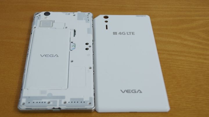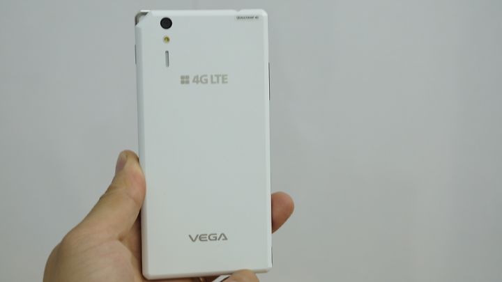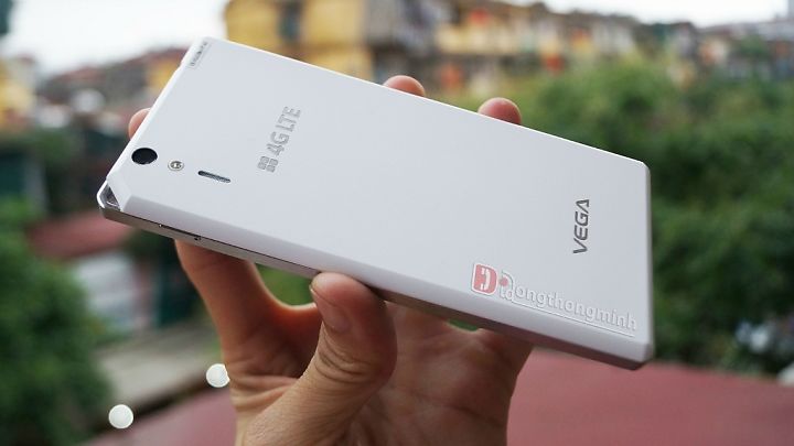 Thân sau của máy là vỏ nhựa cảm giác lì chắc chắn và không bám vân tay, nhẵn nhưng không bóng, camera 13mpx và đèn flash, loa ngoài được bài trí trên cùng 1 hàng dọc. Logo nhà mạng 4G LTE và logo thương hiệu Vega được khắc chìm bằng chất liệu nhôm xước nhìn rất chất. Thích nhất cái logo VEGA có vẻ đẳng cấp hơn nhiều logo SKY!