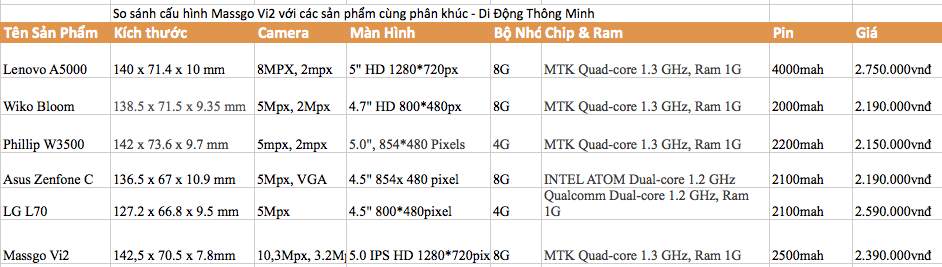 Dựa theo bảng trên chúng ta thấy Massgo Vi2 sở hữu thiết kế có độ mỏng nhất, gọn hơn Leonovo A5000 với cùng màn hình 5″, vượt qua rất nhiều sản phẩm khác vì sở hữu độ phân giải HD, và thời lượng pin đứng thứ nhì sau A5000, nhưng mức giá lại rẻ hơn rất nhiều. Camera trước và sau với số chấm bỏ xa các đối thủ có thể là 1 ưu điểm của sản phẩm này.