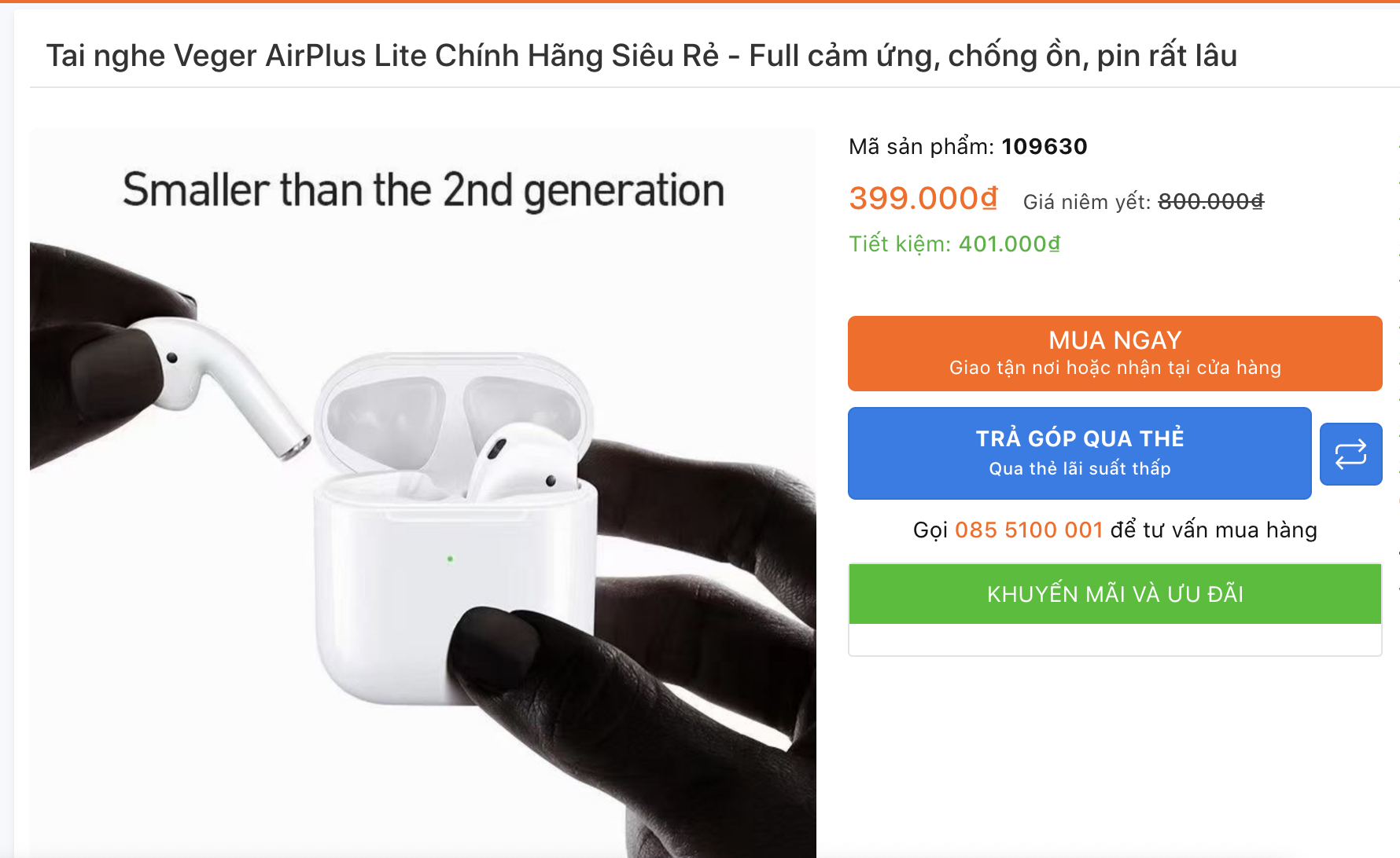 Trước hết về giá bán, Airplus Lite đang đang được giảm giá lên tới 400.000đ chỉ còn 399.000đ. Không giống như tai nghe Fake không rõ nguồn gốc trên thị trường. Đây là tai nghe chính hãng thuộc Veger- thương hiệu chuyên sản xuất phụ kiện chất lượng tại Trung Quốc. Do đó, người dùng sẽ được hưởng chế độ bảo hành 12 tháng nếu sản phẩm có lỗi.