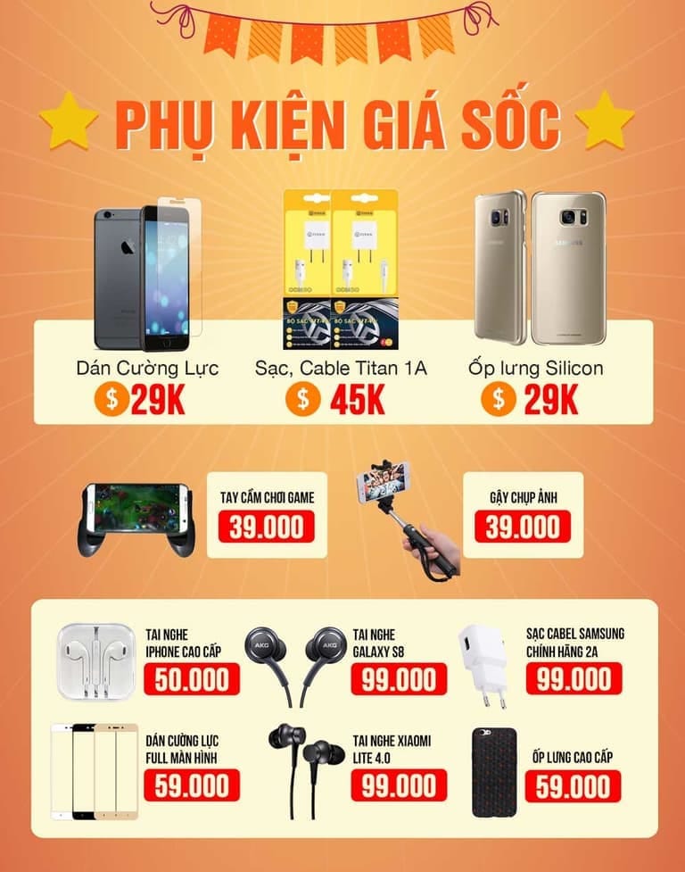 Nếu các bạn chưa chọn được smartphone ưng ý đang được giảm giá sập sàn bên trên thì hãy đừng bỏ qua những phụ kiện đang được giảm 50% tới 70% tại 32 Thái Học 2 1, Chí Linh, Hải Dương; 441 Nguyễn Văn Cừ, Long Biên và 75 Quảng Oai, Ba Vì, Hà Nội như bên dưới nhé. Không mua bạn sẽ tiếc vì đây là món hời cực lớn và số lượng ưu đãi rất hạn chế: