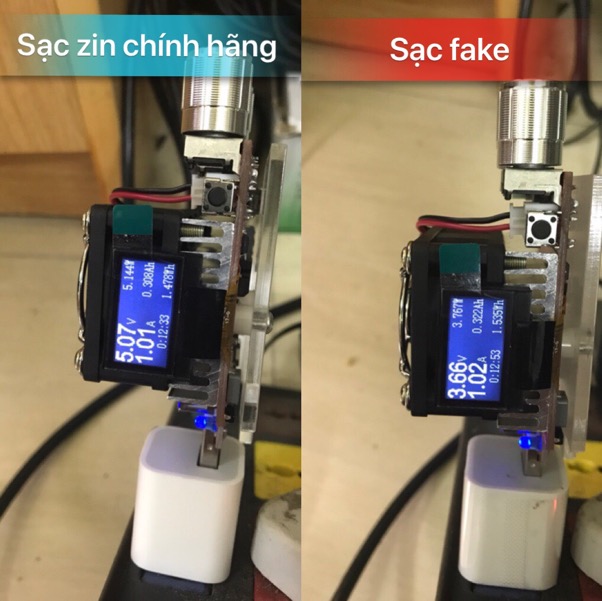 Do nguồn ra củ sạc chính hãng đạt chuẩn 5V_1A, còn củ sạc Fake thì nguồn ra sẽ không đạt tiêu chuẩn nên sạc sẽ lâu và mất thời gian hơn.