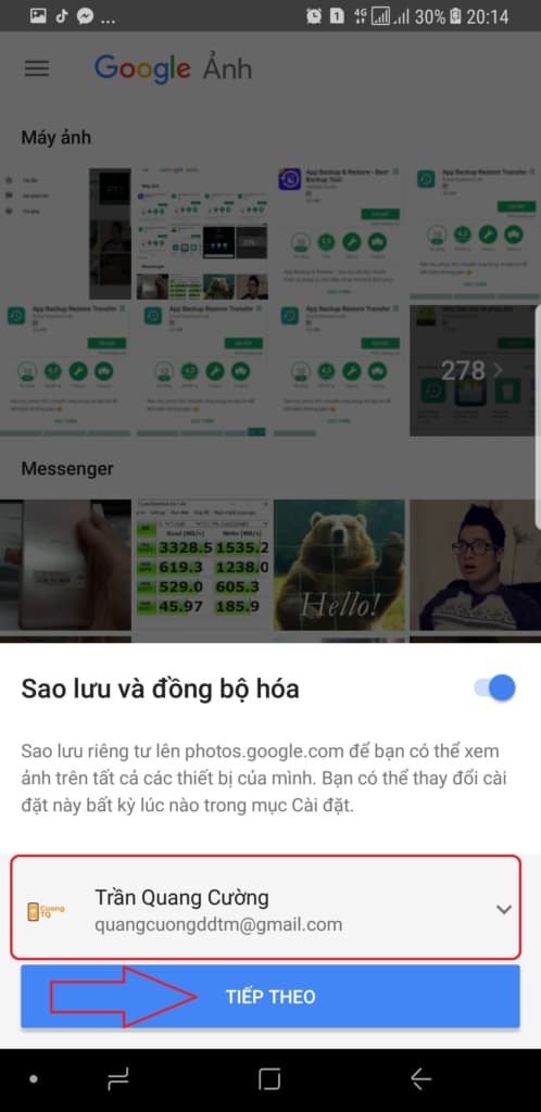 Tiếp theo đăng nhập nếu đã đăng nhập rồi tài khoản google của các bạn sẽ hiện ra như ảnh của mình, nhớ bật xanh biểu tượng Sao lưu và đồng bộ hoá