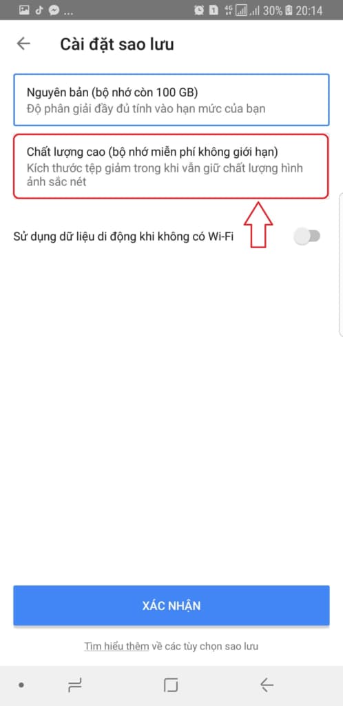 Ở đoạn này ứng dụng có hỏi bạn muốn lưu trữ với dung lượng gốc khi chụp hay tải lên với chất lượng cao vẫn đảm bảo chất lượng, các bạn chọn dòng dưới để không bị giới hạn tải lên rồi bấm xác nhận nhé.