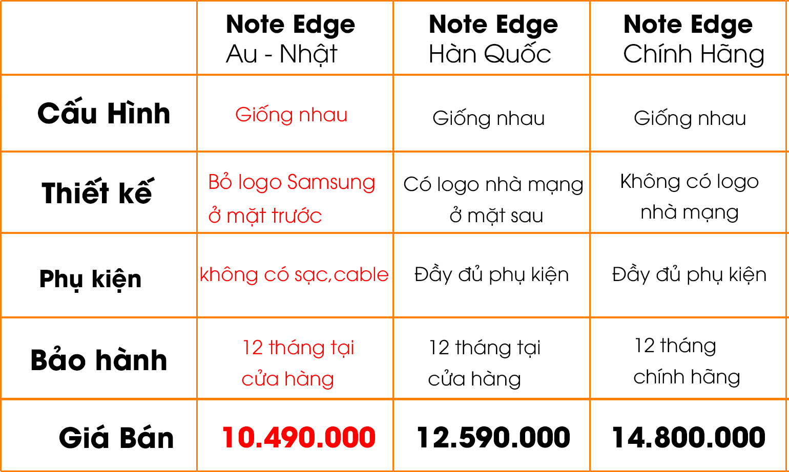 Hiện tại có 3 phiên bản Note Edge chính là bản Hàn, bản Nhật và Chính hãng. Vậy chúng giống và khác nhau những gì ? Mời các bạn cùng xem bảng dưới đây.