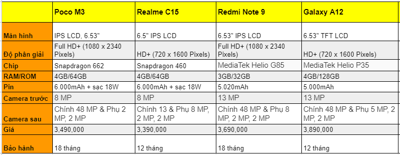 Nằm đầu danh sách là Poco M3, sản phẩm nổi bật với chip Snapdragon 662 có sức mạnh nhỉnh hơn những dòng chip cùng phân khúc như Snapdragon 460 trên Realme C15, Helio P35 trên Galaxy A12,…Duy chỉ có Helio G85 là có hiệu năng tương đương Snapdragon 662, nhưng con chip đến từ Qualcomm lại lợi thế tiết kiệm pin hơn. Điểm cộng tiếp theo đó chính là dung lượng pin 6.000mAh. Kết hợp cùng công nghệ sạc nhanh 18W, Poco M3 có thể dễ dàng đáp ứng nhu cầu làm việc, giải trí trong 1 ngày dài.