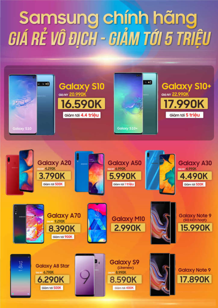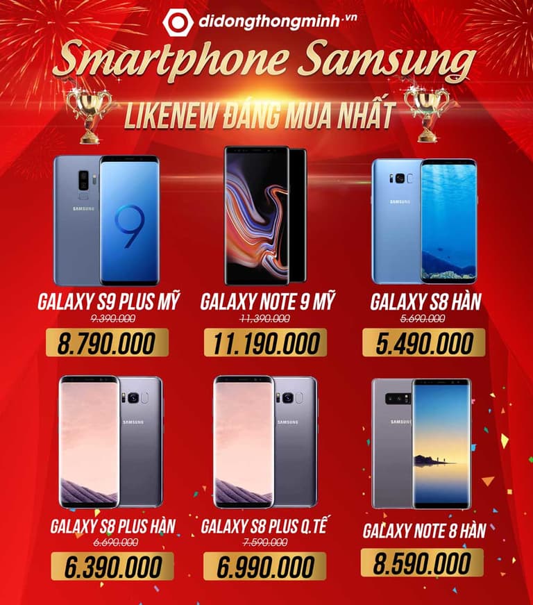 Trước đây, những sản phẩm tầm trung của Samsung không được lòng người dùng bởi cấu hình thấp nhưng lại có mức giá khá cao. Tuy nhiên, điều này đã sai hoàn toàn với Samsung ở thời điểm hiện tại bởi mức giá hãng này đưa ra đã cực hấp dẫn. Cộng thêm những ưu đãi từ phía các đại lý bán lẻ thì số tiền người dùng bỏ ra sẽ tiết kiệm hơn rất nhiều. Và Di Động Thông Minh là một trong những hệ thống bán lẻ đang niêm yết giá của các sản phẩm của Samsung giá tốt nhất thị trường. Chi tiết báo giá các sản phẩm Samsung chính hãng, Samsung Likenew các bạn tham khảo dưới đây: